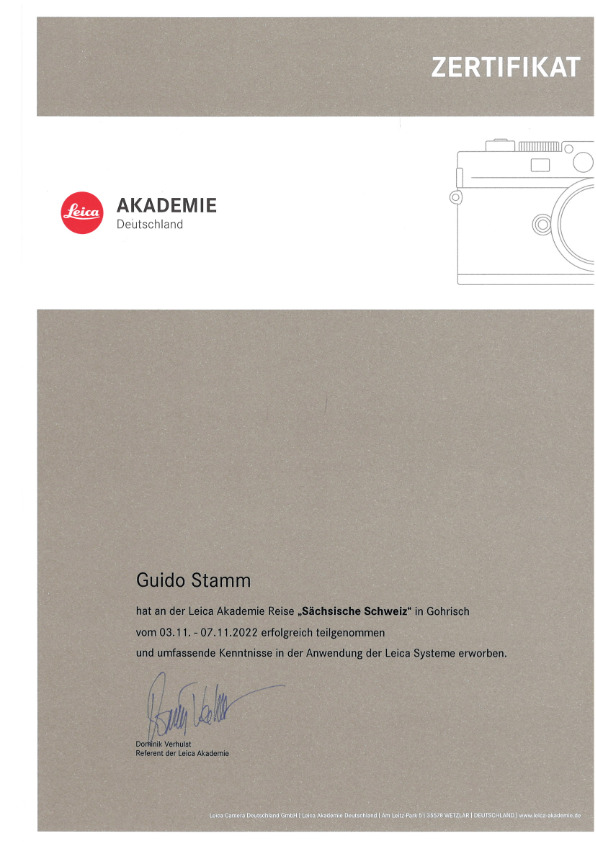 Guido Stamm verlässt sich nicht nur auf sein Talent, sondern auf fundierte, zertifizierte Weiterbildung. Sein Wissen gibt er strukturiert und verständlich an Sie weiter. Seine Qualifikationen bei der Leica Akademie umfassen: