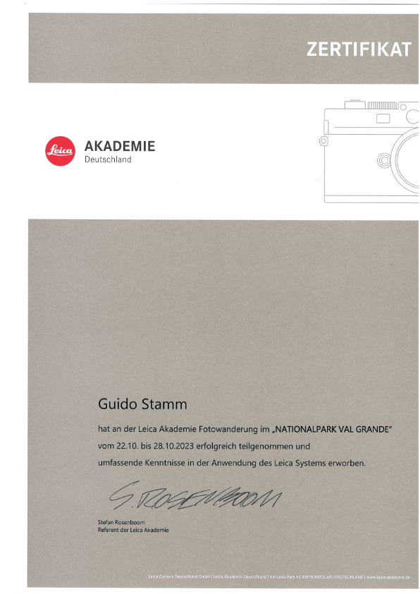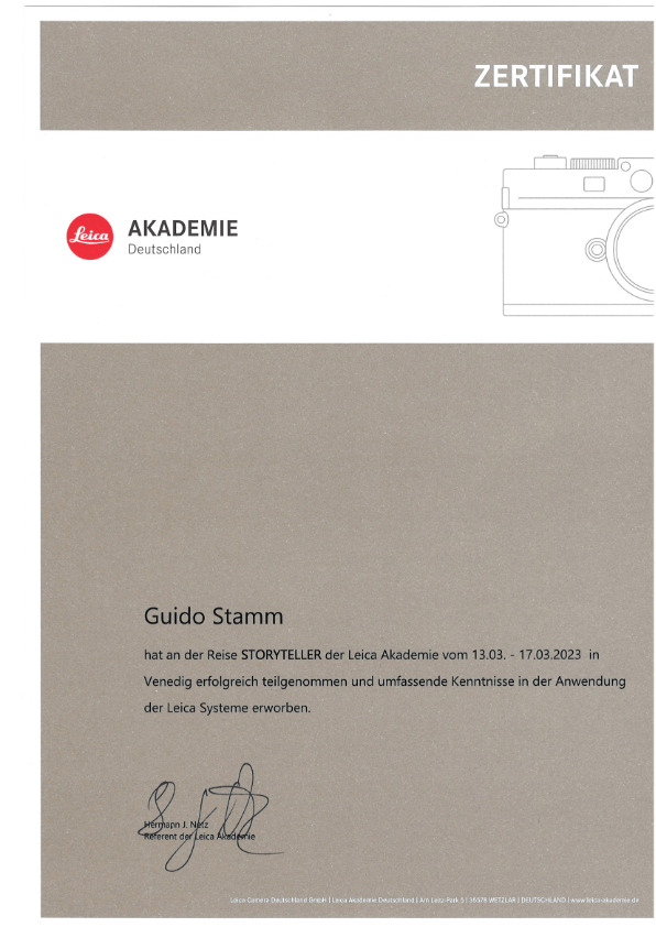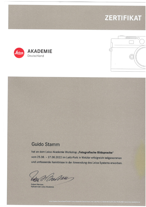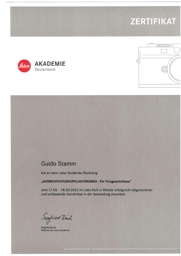 Guido Stamm verlässt sich nicht nur auf sein Talent, sondern auf fundierte, zertifizierte Weiterbildung. Sein Wissen gibt er strukturiert und verständlich an Sie weiter. Seine Qualifikationen bei der Leica Akademie umfassen: